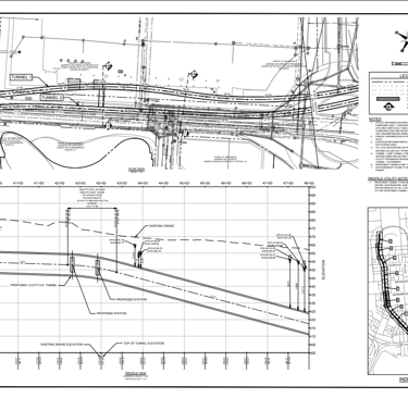 The engineering sheets include plan-and-profile drawings, cross sections, parcel maps, and utility layouts over a 17-sheet set. Grades in the preliminary design reach up to 7%, which is within the range of other Loop systems, including the company’s Las Vegas project.