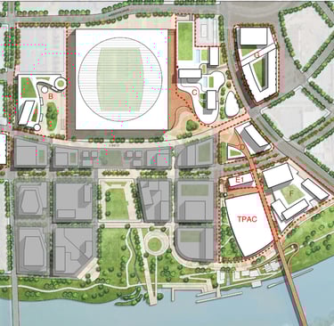 Publicly released plans for TPAC show a prominent green space and public gathering area along the northeastern edge of the site. This location offers a promising footprint for an underground station that would remain out of view while providing direct access to the performance venue. Because TPAC is still in the design and construction phase, the project team retains the flexibility to incorporate climate-controlled passages or other forms of integrated access.