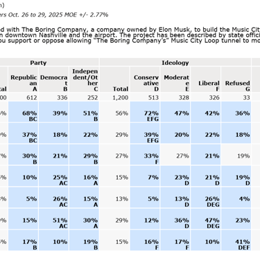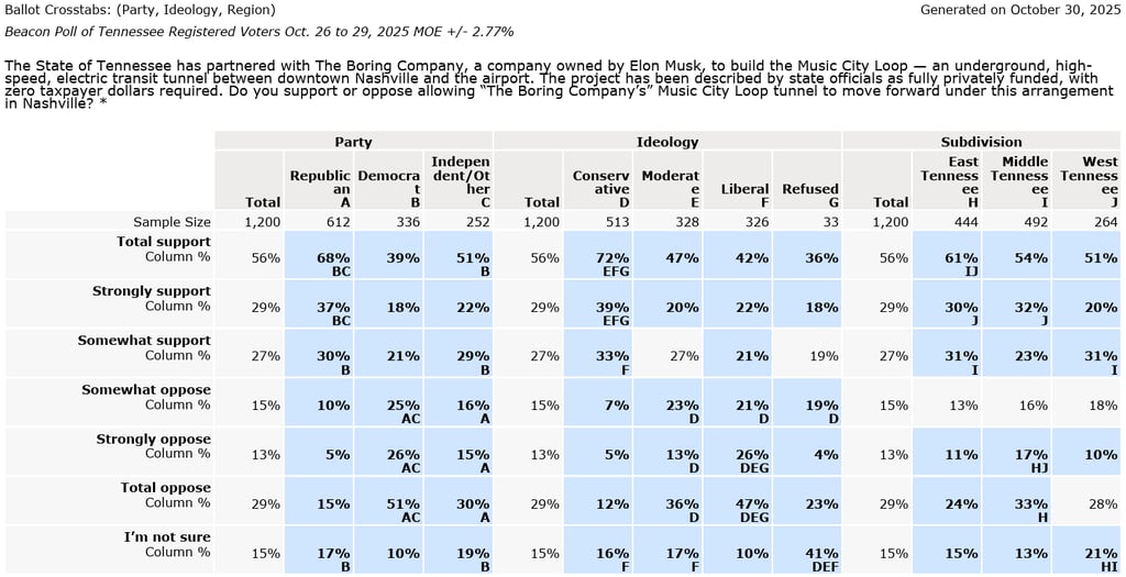 The survey, conducted October 26–29, 2025, sampled 1,200 registered voters across the state and carries a margin of error of ±2.77%. Respondents were asked whether they support or oppose allowing The Boring Company’s Music City Loop tunnel to proceed under the current state arrangement.